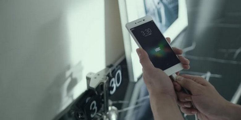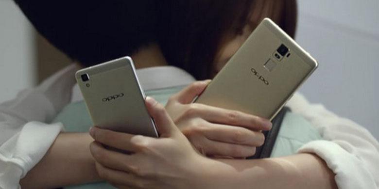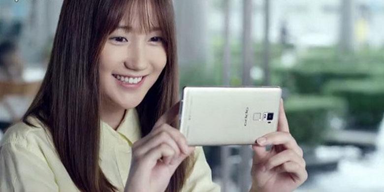 Seorang model dalam iklan Oppo sedang menggunakan ponsel R7 Plus yang memiliki pemindai sidik jari